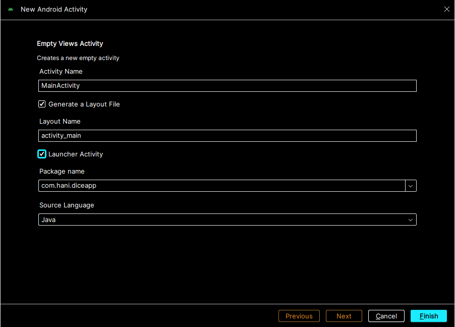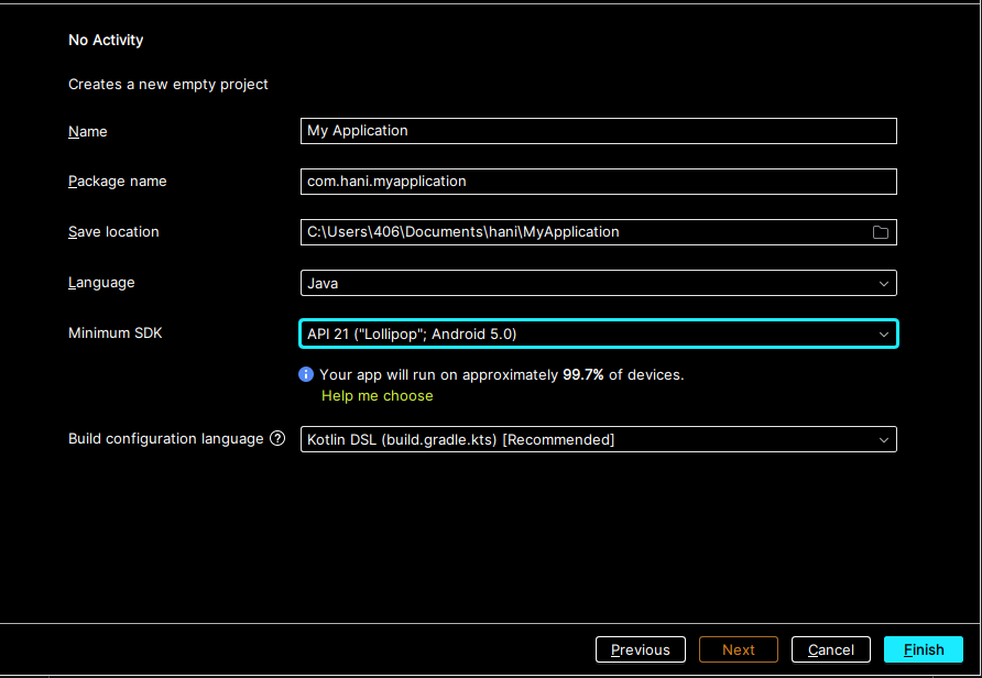 패키지 이름은 com.개발자의이름 or 회사의 이름 같은 단체의 이름으로 가는게 좋다.앱의 이름은 자동으로 붙여준다