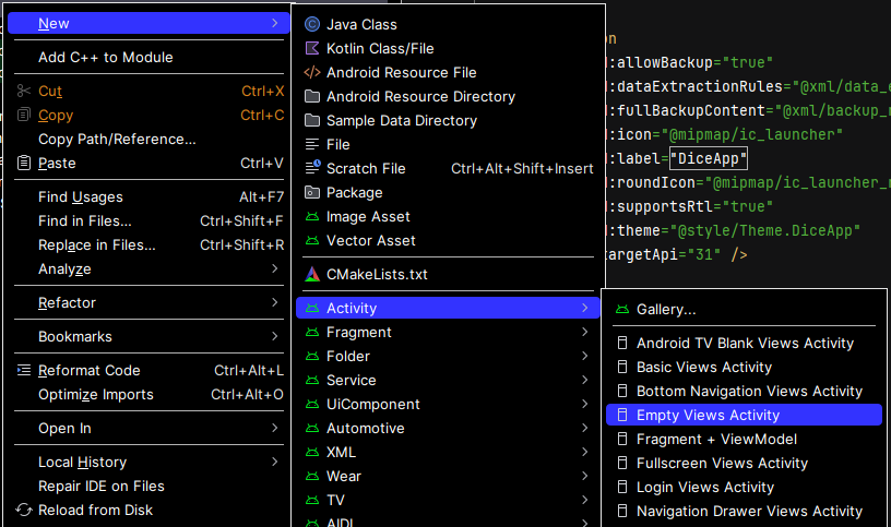 Empty Views Activity를 클릭