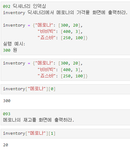 인벤토리(변수명)는 딕셔너리 지만 밸류값은 리스트