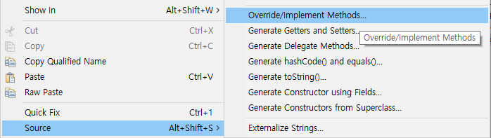 위와같이 마우스 우측 클릭을 하면 오버라이드 메소드를 편히 사용하는 툴이 있는데
