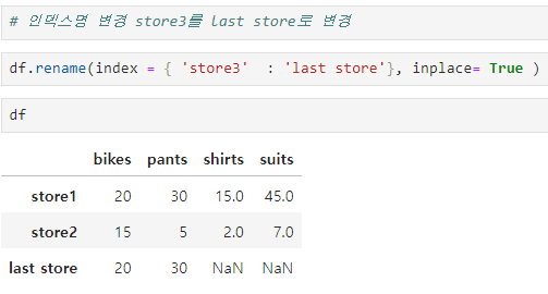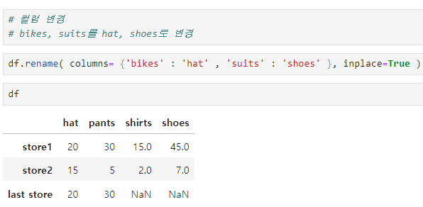 변수.rename(인덱스 or 콜럼 = { 'before' : 'after' }