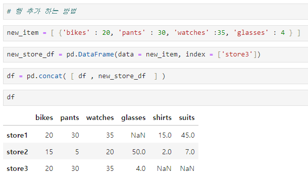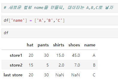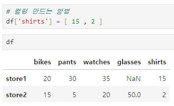 우선 변수에서 [ ]에 만들 열의 이름을 적고 저장할 value값을 [ , ] 괄호안에 넣어주자